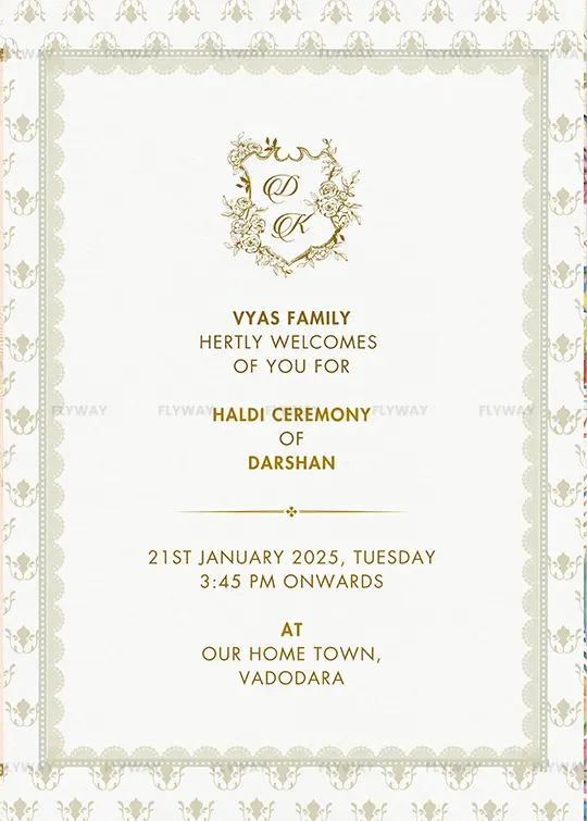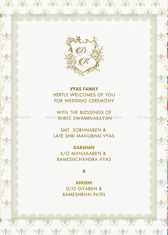 An elegant digital wedding invitation featuring a golden floral crest monogram, traditional patterns, and a minimalist royal touch. Ideal for modern yet traditional Indian weddings.