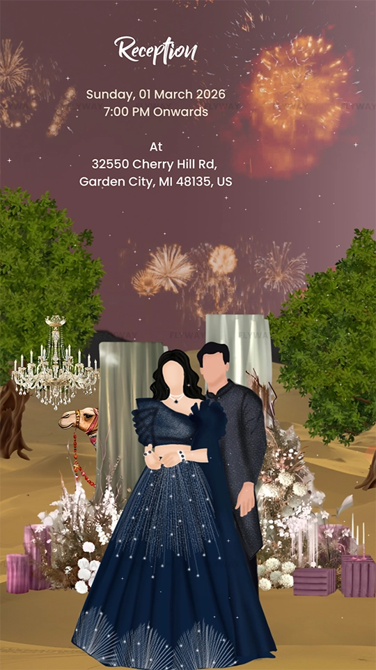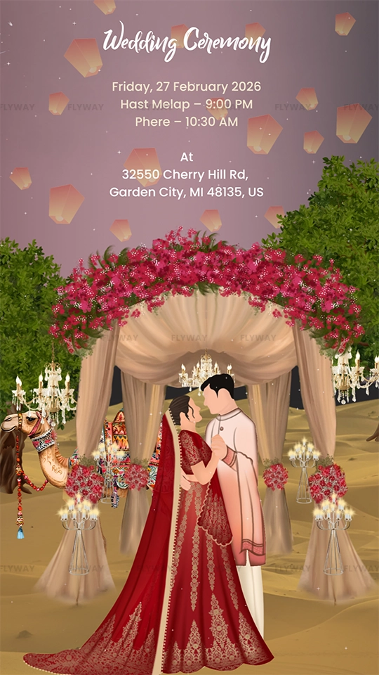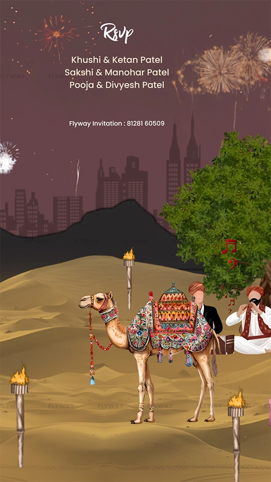 Celebrate your special day with a vibrant and culturally rich Rajasthan desert-themed wedding invitation video featuring traditional motifs and elegant animations.
