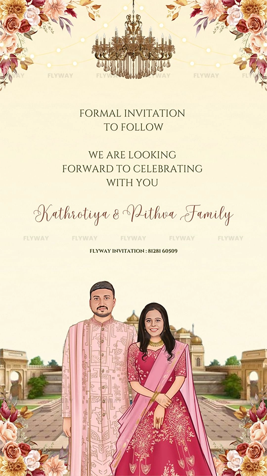 Celebrate your wedding in royal grandeur with this heritage-inspired Save the Date invitation. Featuring majestic palaces, vibrant peacocks, floral elegance, and illustrated portraits.