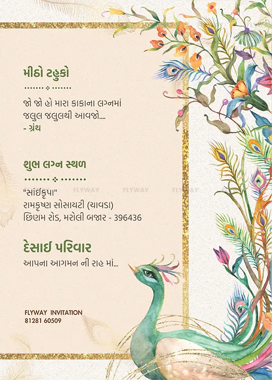 A luxurious digital wedding invitation set with elegant peacock motifs, golden borders, and floral artwork. Perfect for traditional Indian weddings with a royal and festive touch.